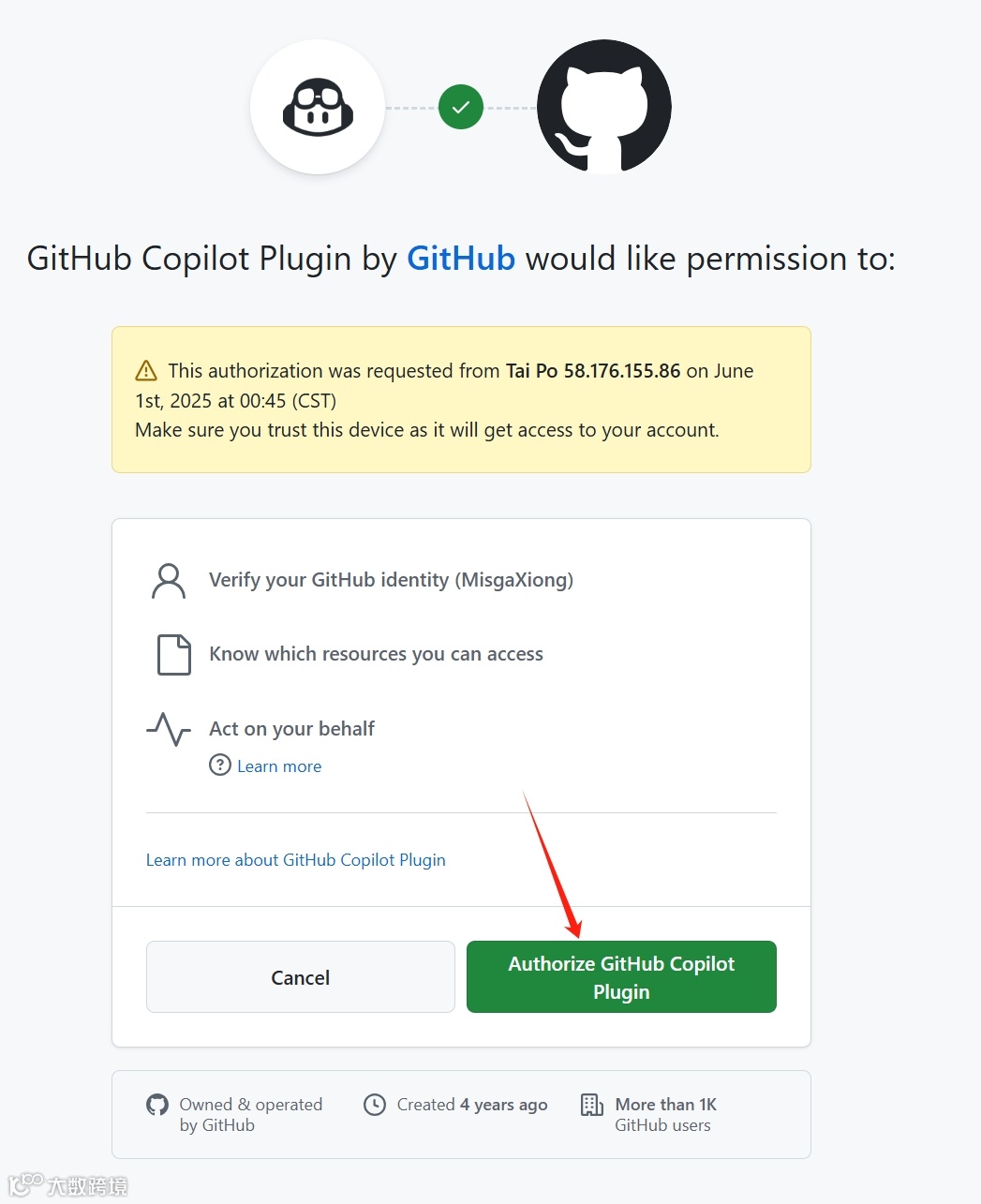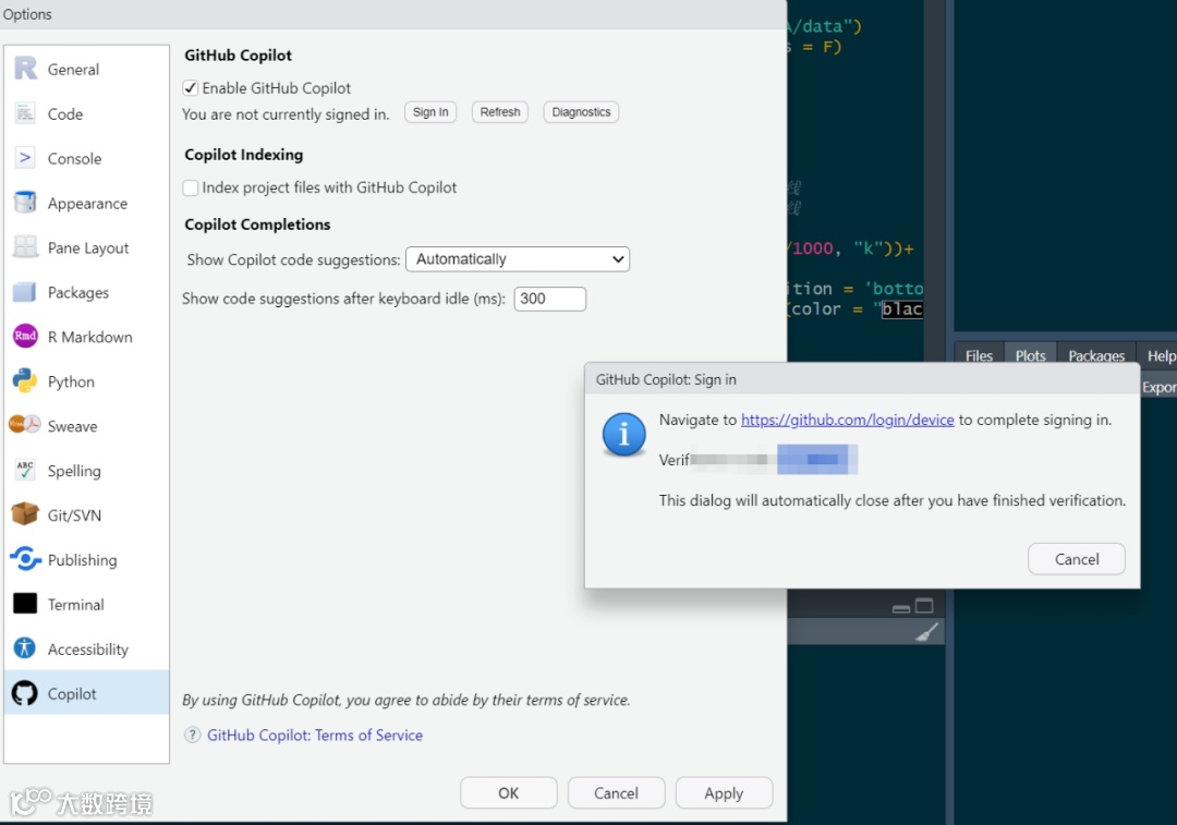 插件安装好后,点击Sign In,Rstudio会给你一个验证码,复制此验证码进入Github,然后点击授权确认接入Github Copilot插件。