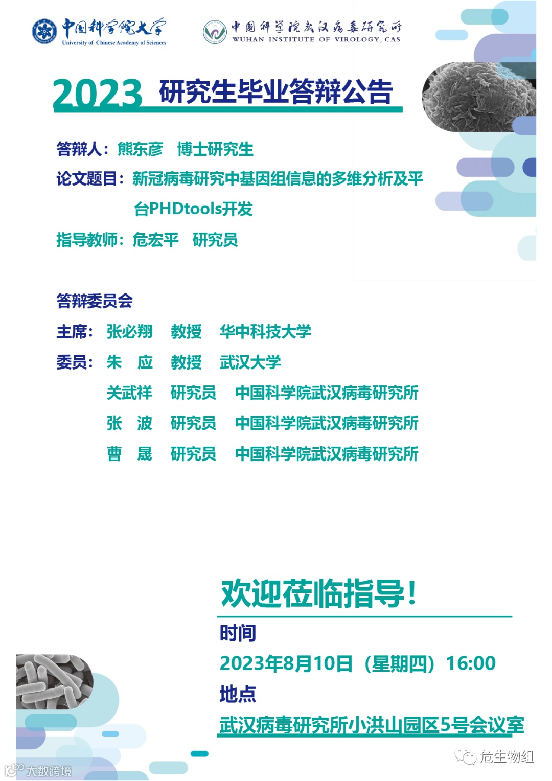 我的毕业答辩将在8月10号16点开始,在病毒所的小洪山园区5号会议室。我估计很多粉丝已经放暑假回家了,不过如果还在武汉而且那天没啥实验或者比较闲暇的,可以联系我,我带你旁听我的毕业答辩。之前有粉丝问我毕业答辩能不能开直播啥的,现在看来是不太可能了,我提前考察过那个会议室,里面网络非常差。直播是不可能了。下面我就把自己的答辩信息给预告一下。