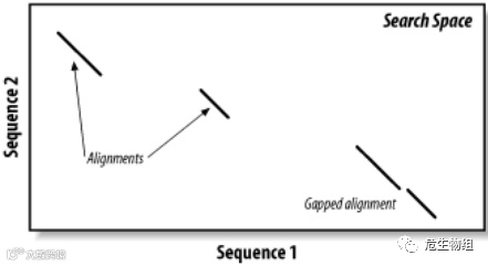 Specially, the search space between two sequences can be visualized as a graph with one sequence along the X-axis and the other along the Y-axis(As shown in Figure 2). Each point in this space represents a pairing of two letters, one from each sequence. Each pair of letters has a score that is determined by a scoring matrix whose values were determined empirically. An alignment is a sequence of paired letters that may contain gaps. Ungapped alignments appear as diagonal lines in the search space, and the score of an ungapped alignment is simply the sum of the scores of the individual letter pairs. Alignments containing gaps appear as broken diagonals in the search space, and their score is the sum of the letter pairs minus the gap costs, which usually penalize more score points for initiating a gap than extending a gap. In a BLAST report, unaligned regions aren't displayed, and gaps are represented by dashes. However, a simple change in parameters can change one into the other. The diagrams in this chapter show only one gapped alignment, which is indicated in Figure 2.