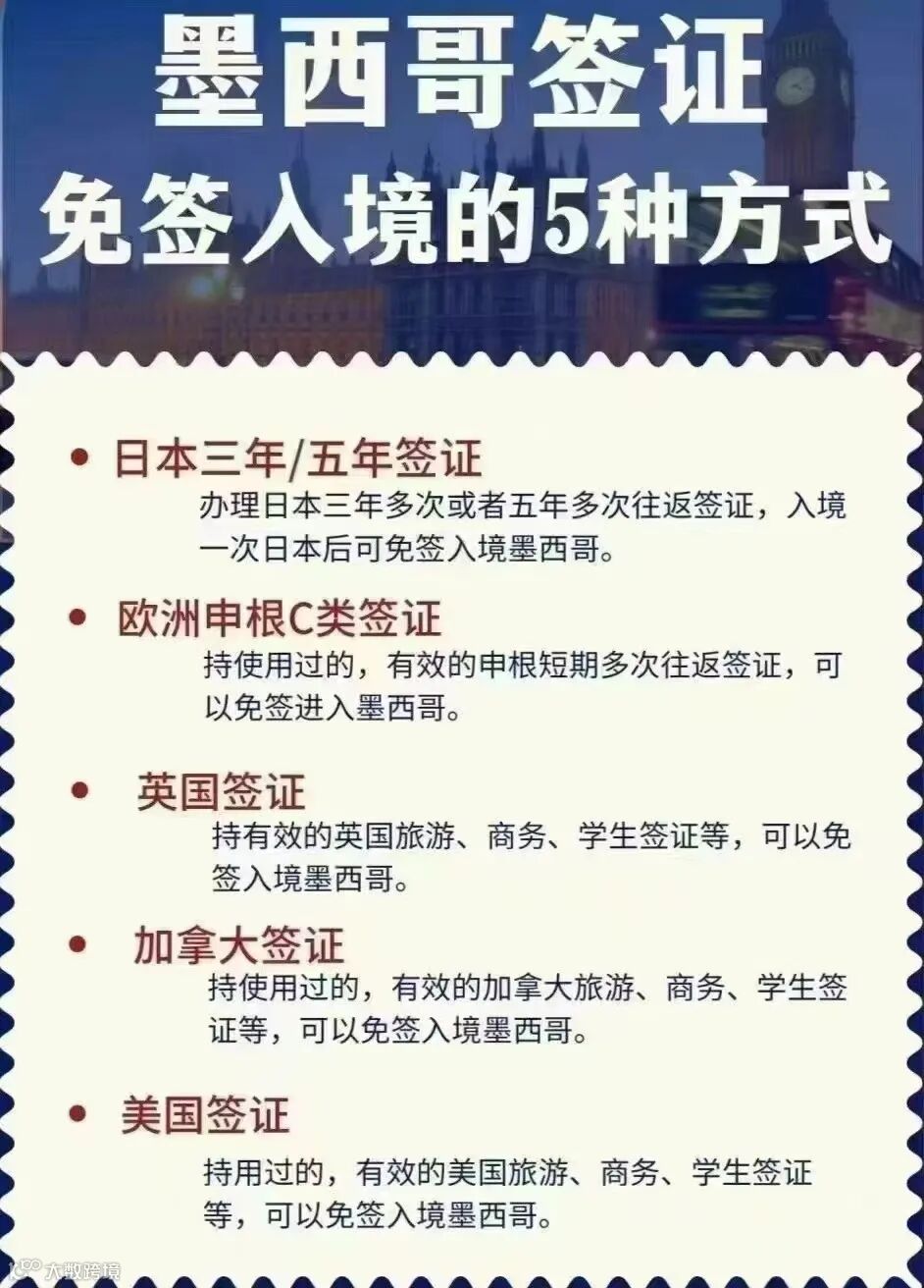 如果对于觉得墨西哥签证办理困难或者感觉自己的条件无法办理的话,其实不妨看看下面关于墨西哥的免签政策,只要拥有下面的任何一个签证,都可以和拥有墨西哥签证一样进入墨西哥的!