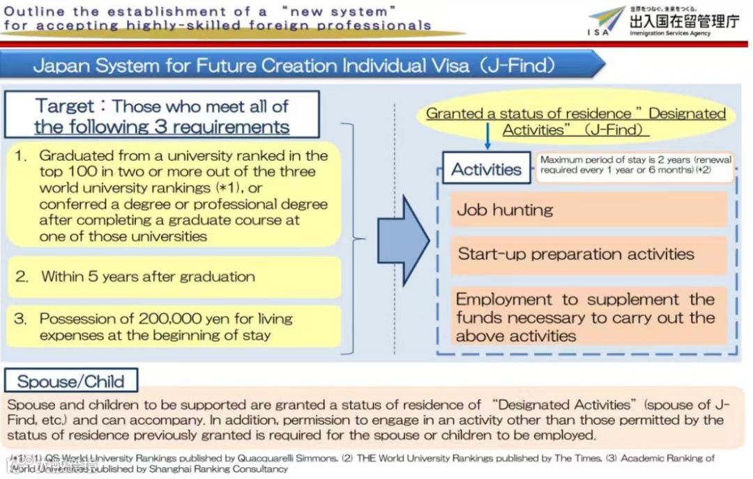 这项被誉为“未来创造人才签证”的新政,于2023年惊艳登场,旨在广纳全球高端人才。与传统工作签证截然不同,它打破常规,无需申请者提前手握日本雇主的橄榄枝,直接赋予持有者入境日本的特权,两年有效期内,可尽情探寻心仪工作,或是精心筹备创业大计,无疑是一条直通日本高端人才市场的康庄大道。而且这对那些希望进入日本职场或利用日本市场资源创业的年轻人来说,是一个前所未有的机会。