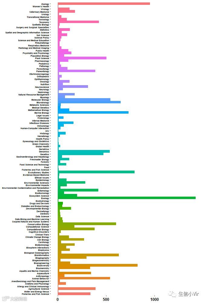 除了关注生物信息学的发文情况,再把目光转移到各个生物学领域上,将PeerJ内的所有文章按照研究领域分类,进行发文数量的分析