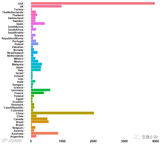 文章都有作者所在单位的信息,继续挖掘一下作者单位信息,先看看这些单位都是来自哪些国家的,通过这些信息也可以反映国家科研实力的表面强弱