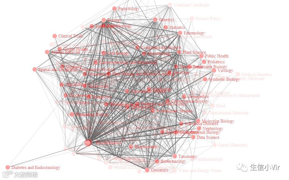 从结果中看出,最高的发文量还是以动物学这些一级学科,不过这里面涵盖了很多二级学科,以二级学科分类生物信息学的发文量是非常高的,基因组学、细胞生物学、生态学等发文量也非常高。从之前的关联网络分析结果可以推测这些学科的发文量也有生物信息学的推动。