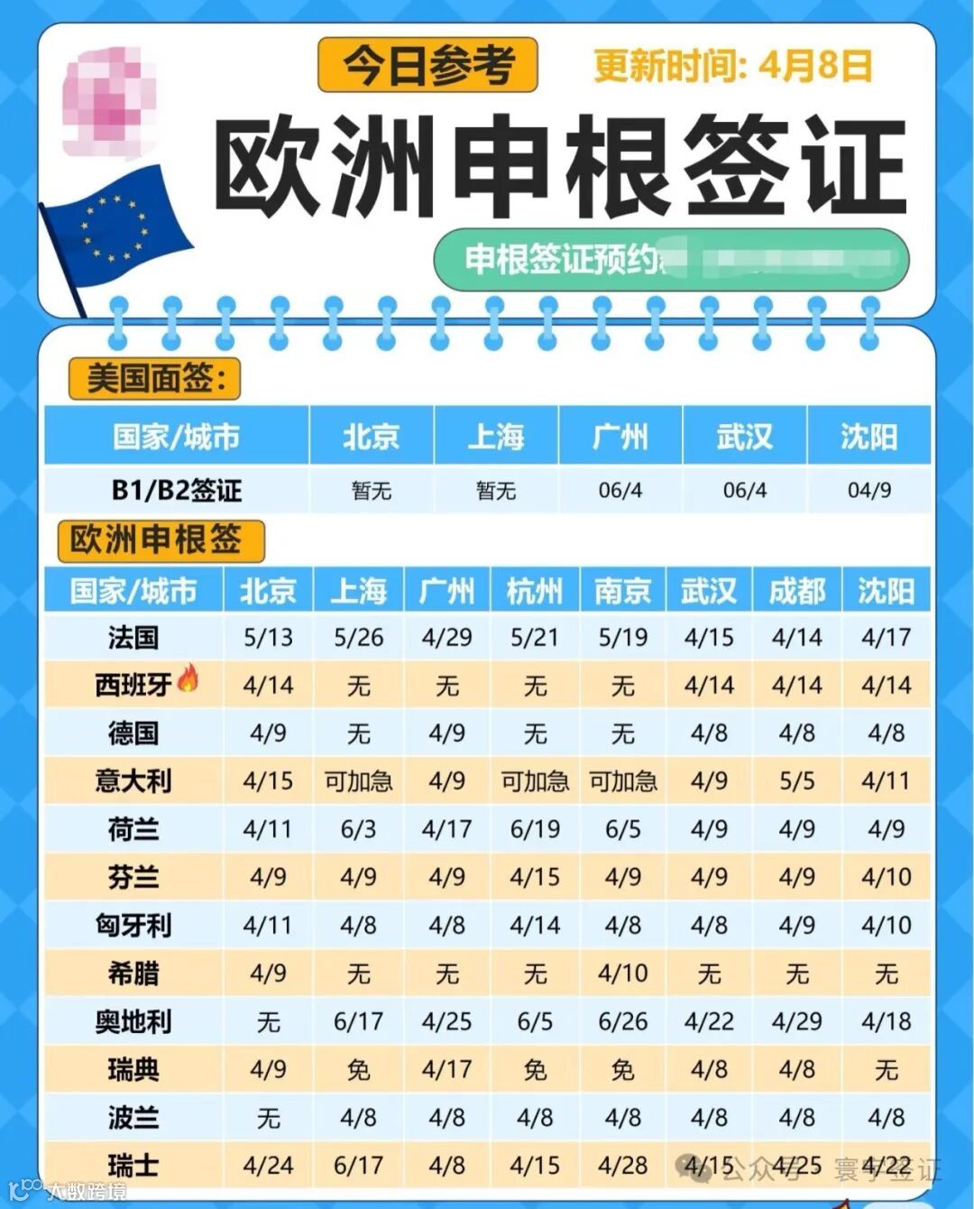 全球申根各国签证最新可预约面签时间速递(4月8日)
