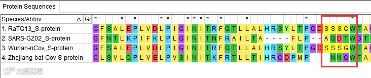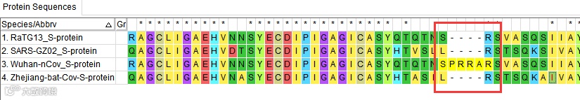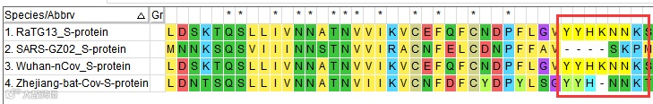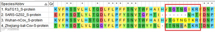 我们将这几条序列进行多序列比对,得到比对后结果,好,此时我们来一一对照是否真的这4个插入只存在于2019-nCov的S蛋白上呢