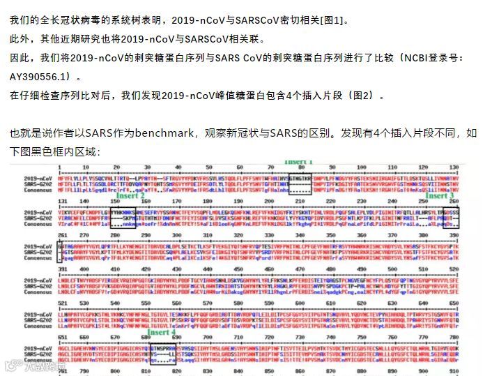 从截图中来看,这篇文章的作者是将武汉爆发的新型冠状病毒(2019-nCov)的S蛋白(氨基酸序列)与SARS-GZ02(SARS病毒的某一毒株)和普通冠状病毒的序列进行了比较,发现有4个插入。由此,他们把这4个插入的序列再放回数据库比对(现在对方也撤稿了,我无法仔细分析原文),然后发现找到了高度相似的HIV序列,所以他们怀疑这个似乎不是自然形成的,于是乎他们便把他们的怀疑原封不动写在了文章里,然后某些公众号就开始脑补人为改造了,于是就有那个可怕,让朋友圈很多人跟转的、评价的、关联的、恐怖的人为改造的生物武器言论。虽然稿件撤了,但是预热不减,尤其在中国。