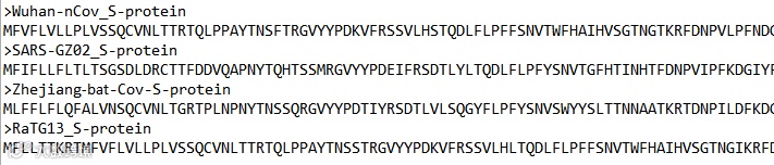 通过系统发育结果来看,尽管2019-nCov属于beta冠状病毒类群(图中红色字体标出部分是2019-nCov),但是依然与SARS-Cov和MERS-Cov有较大的遗传距离(可以理解为有较大差异),且相对于MERS-Cov的遗传距离更大(可以理解为相对于MERS-Cov的差异比相对于SARS的更大)也可参见原文(Overall, there is considerable genetics distance between the Wuhan CoV and the human-infecting SARS-CoV, and even greater distance from MERS-CoV. )这个信息告诉了我们Wuhan-Cov和SARS-Cov还有MERS-Cov是有差异的,所以比对他们之间的核酸或者蛋白序列,一定是有差异的。于是乎,印度科学家就拿着2019-nCov的S蛋白和其他SARS的S蛋白进行比对了(之所以选择S蛋白比对是因为S蛋白分为两个具有功能的部分S1, S2,其中S1的C端结构域是与宿主受体直接相互作用的RBD结构域),但是印度科学家只是比较了另外两个距离较远的SARS病毒S蛋白序列,却忽略了前段时间中国科学院武汉病毒研究所石正丽老师发表的论文,论文中石老师已经分析出来2019-nCov与她们团队在2013年云南省采样的时候搜集到RaTG13毒株具有约96%相似性,我们可以这样想想,如果Wuhan爆发的2019-nCov序列真的如印度人所说有4个非自然产生的插入,那么RaTG13基因组上一定不存在这4个插入。为了让我的这次科普结果更具有说服力,更能被广大人民群众重复验证,我将我的分析结果展示出来,我选择了4条序列作为分析序列,一条是2019-nCov的序列(Genbank号:MN908947.3),RaTG13(Genbank号:MN996532.1),SARS-GZ02(印度人选择的比较序列,Genbank号:AY390566.1),以及其他任意一条冠状病毒序列(我选择了浙江舟山冠状病毒序列,这是除去RaTG13以外与2019-nCov最接近的一条序列,Genbank号:MG772933.1),那么接下来我提取了这4个病毒基因组中编码的S蛋白的氨基酸序列,如下图