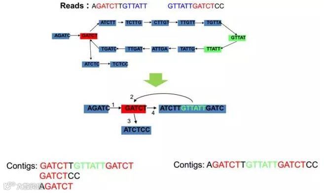 基因组估计完后,就是对基因组的组装。而实际组装中有一个很有意思的现象。理论上说,测序深度越深,越有利于获得完整基因组。但是实际情况并不是这样。就拿我来说,之前我们研究所有其他实验室的师姐把她的噬菌体测序数据给我组装,她反馈给我的情况是使用spades组装,2G的测序大小组装效果还没有1G测序大小的组装效果好。她很不理解这是为什么。因为,她可以保证两次测序的实验准备都是很好的,建库也是很好很完整的。但是实际组装却是1G大小组装出了130kb,2G大小只组装出了96kb。这里测序批次问题并没有影响多大。(测序公司给出的回复)对于这个情况,我们来仔细分析一下。为什么2G的组装比1G的组装效果差。首先目前二代测序基因组De novo组装主流是基于De Bruijn graph进行组装。这是一种数学图论中的知识,如果接触过一笔画的同学可能会对这种方式有更深刻的认识。上篇推文中已经介绍了,在基因组分析中首先会将reads打散成更短的kmer,在基因组组装的过程中,这些kmer就派上了用场。reads被打断成长度为k的核酸片段(kmer)后,利用De Bruijn graph根据kmer间重复的部分构建graph,得到最优化路径从而拼接contig。那么如何利用kmer进行基因组组装呢?这里用网上的一幅图来助大家理解。两段reads AGATCTTGTTATT和GTTATTGATCTCC,选择长度为5的kmer打散。再根据kmer之间的overlap构建路径。如图从AGATC开始,依次往后步移一个碱基,当步移到红色方框的kmer时有了两种可能,由于两段reads有一段GTTATT的overlap,红色方框对应的kmer恰好有两种步移路径,一条是ATCTT(沿着第一条read的方向),一条是ATCTC(第二条read的方向),这两条路径最后都有不同的组装方式。对于第二条read, 绿色部分GTTAT->TTATT恰好又是它的起始也是第一条read的结束。那么根据下图的第一幅路径图可以优化为第二幅路径图。这样就将reads连接起来了。