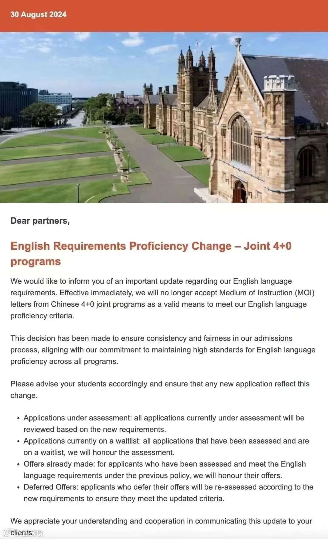 悉尼大学则宣布不再承认中国4+0项目的语言成绩证明,并表示是为了确保招生过程中的连贯性和公平性,符合对所有课程保持英语语言能力高标准的承诺才做出这一决定。