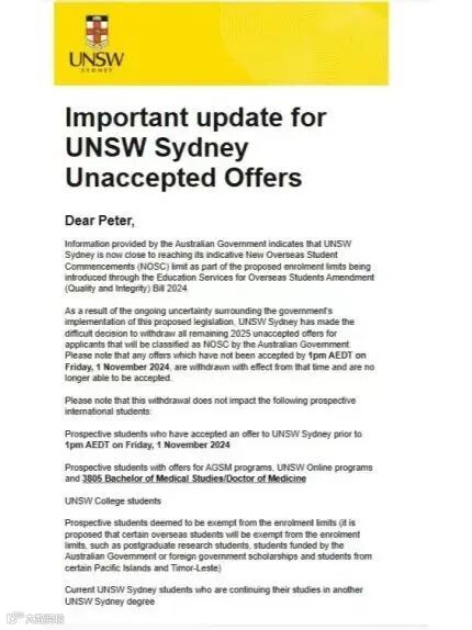 2025年2月,堪培拉华人留学圈被两则重磅消息炸开了锅——新南威尔士大学(UNSW)突然关闭2025年所有入学季的留学生申请通道,甚至官宣,撤回所有未接受的offer!