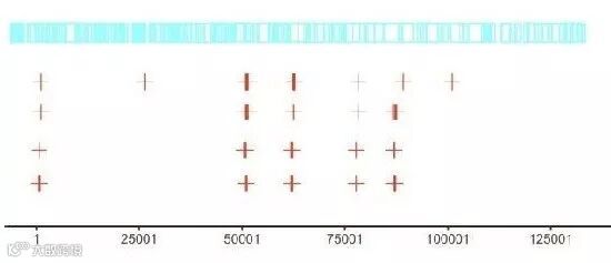 蓝色条框是我的参考基因组CDS区域,红色十字点代表我的SNP/SNV的变异位置,每一行代表每个样本。由于本人AI操作水平很烂,这个图制作效果不高。以后还得提升自己作图能力!
