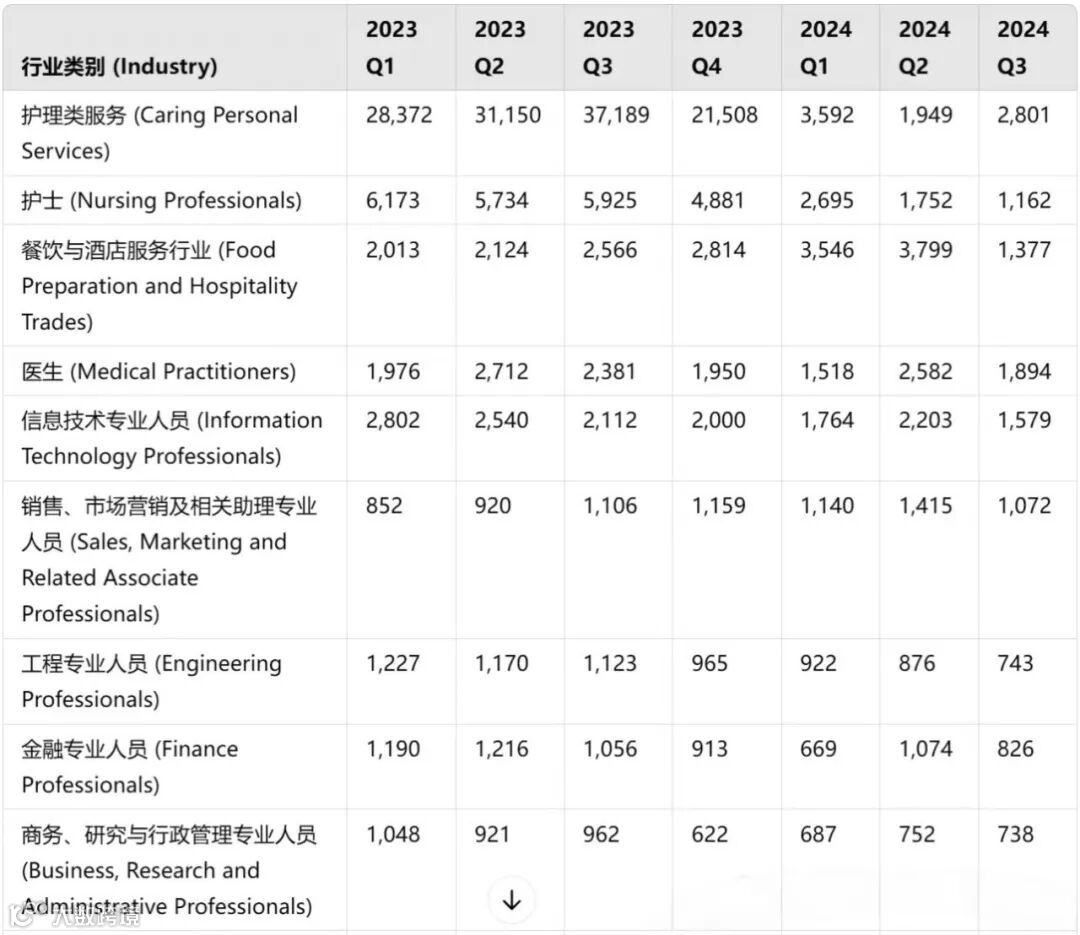 从上述材料中不难看出,护理类工作的降幅最大。与 2023 年相比,2024 年平均每季度下降约 10%。造成这一变化的原因很可能是护工、高级护工的申请人不再允许其家属申请陪伴签证。因此,前几个季度出现的高申请数量再难持续。
