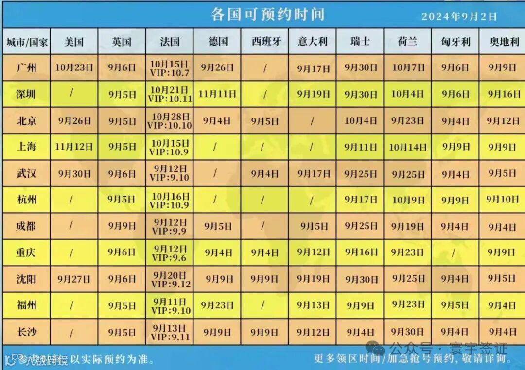 9.2 更新!近期欧美各国签证可预约日期,参考上图,具体以实际预约为准。美国最早可约9月26日,欧洲申根最早可约9月4日。