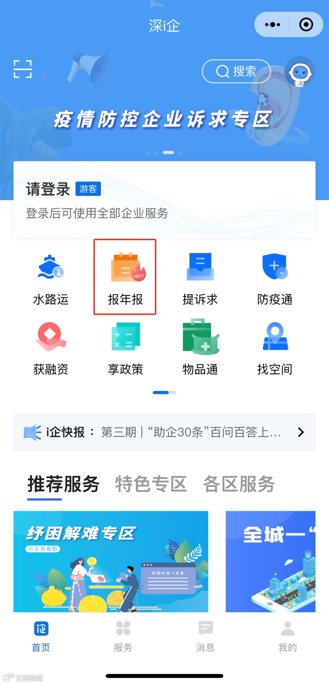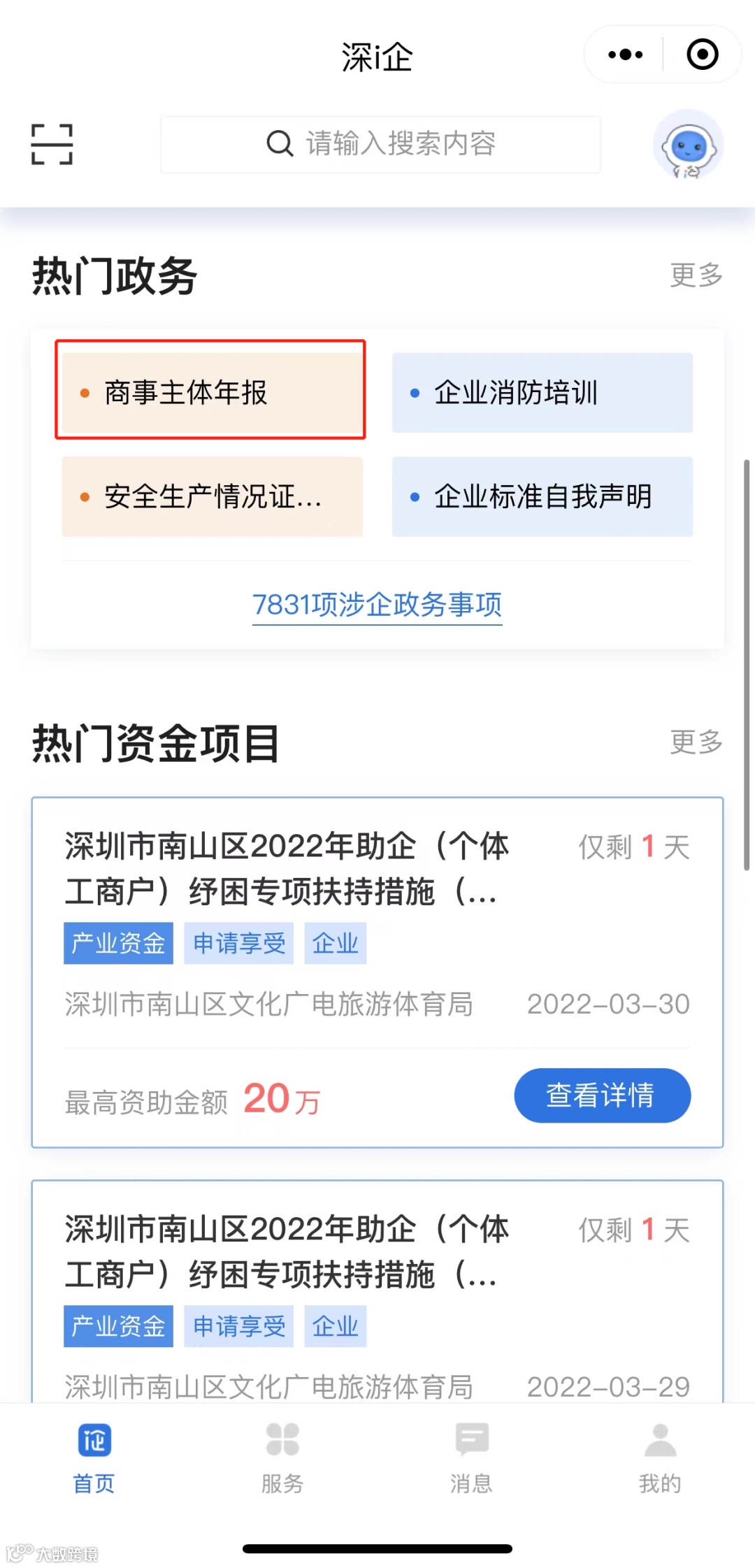 方式二:登录“深i企”移动端,进入首页【报年报】或【热门政务】-【商事主体年报】,按提示报送年报。