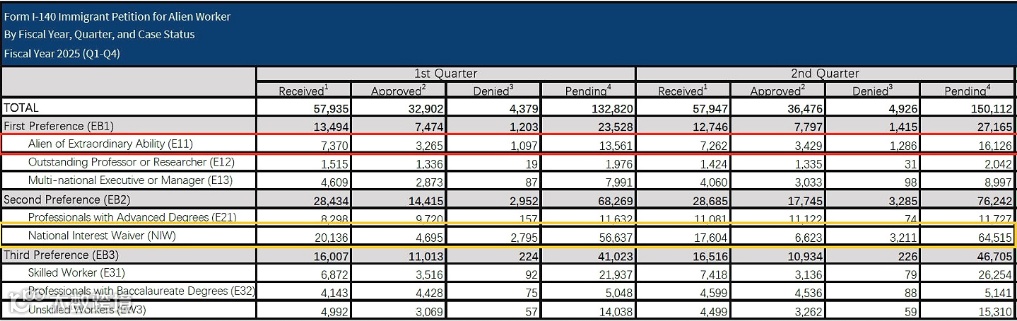 EB-1A:2025财年前两季度,共收到14,632份申请,获批数量为6,694份,拒签2,383份,处于待审积压状态的有29,687份,获批率约为73.7%。