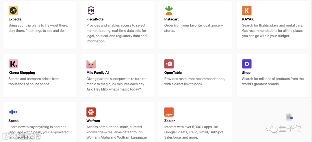 目前已支持的第三方插件,可以看到有餐厅推荐、旅行计划、购物、AI语言老师、网上店铺,以及学术界知识应用Wolfram、应用库(与5000多个应用程序交互,包括Google表格)……