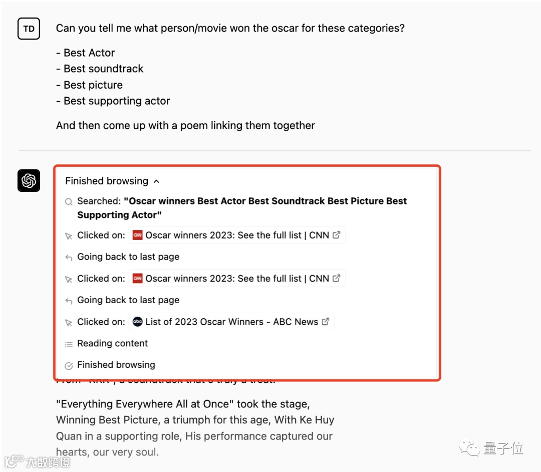 结果可以看到,ChatGPT在聊天界面就多出来“浏览”结果,直接得到了最新2023年的结果。