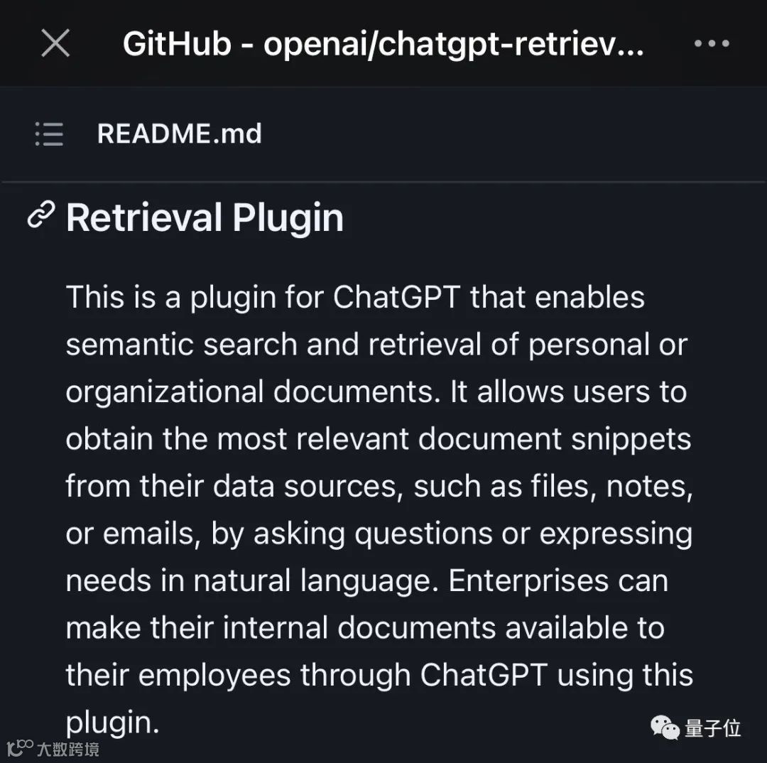 除此之外,OpenAI自己也有两种插件:网络浏览器和代码解释器,并开源了一个知识库检索插件的代码。