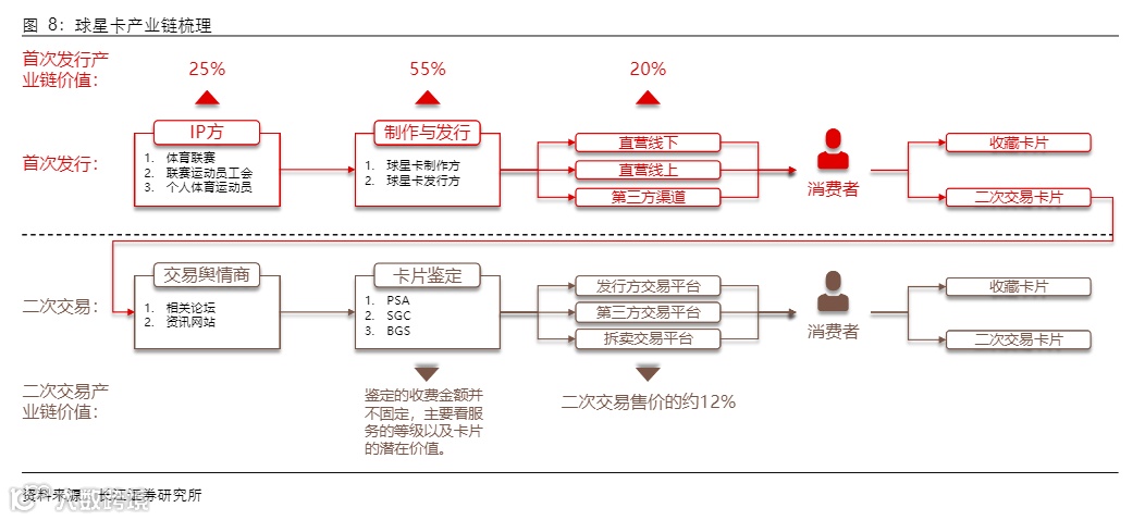 球星卡商业模式主要涉及售卡的一级市场以及售卡后再交易的二级市场。一级市场指的是发行商依据授权IP制作、发行球星卡,再通过多样渠道触达一级消费者的市场。二级市场指的是球星卡在销售者中进行二次流转的交易市场。
