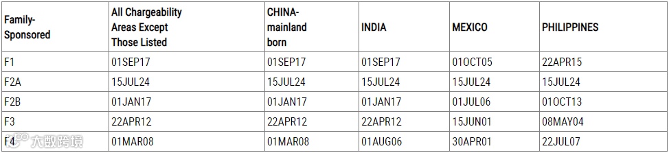 F1(美国公民申请成年未婚子女)类别排期为2017年9月01日,原地踏步;