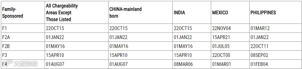F2A(绿卡持有人申请配偶和未成年子女)类别排期为2022年1月1日,原地踏步;
