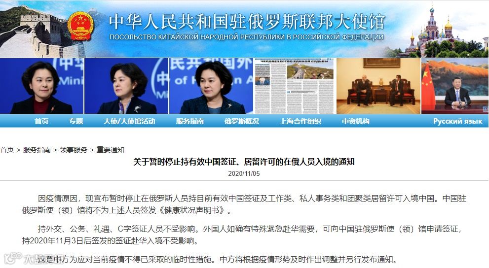 持外交、公务、礼遇、C字签证人员不受影响。外国人如确有特殊紧急赴华需要,可向中国驻俄罗斯使(领)馆申请签证,持2020年11月3日后签发的签证赴华入境不受影响。