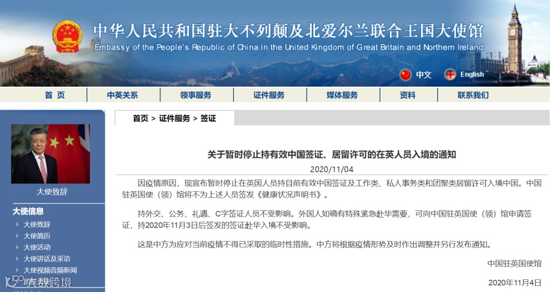 持外交、公务、礼遇、C字签证人员不受影响。外国人如确有特殊紧急赴华需要,可向中国驻英国使(领)馆申请签证,持2020年11月3日后签发的签证赴华入境不受影响。