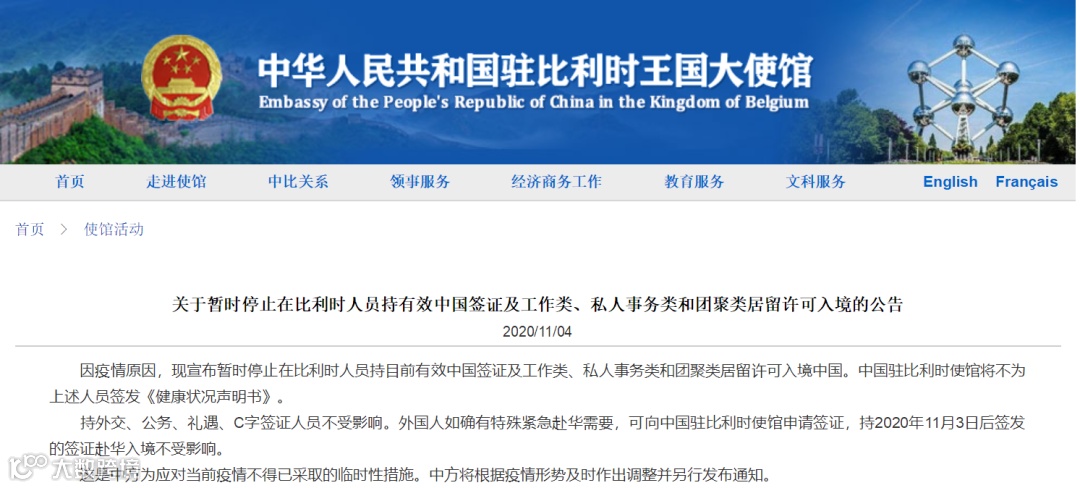 因疫情原因,现宣布暂时停止在比利时人员持目前有效中国签证及工作类、私人事务类和团聚类居留许可入境中国。中国驻比利时使馆将不为上述人员签发《健康状况声明书》。