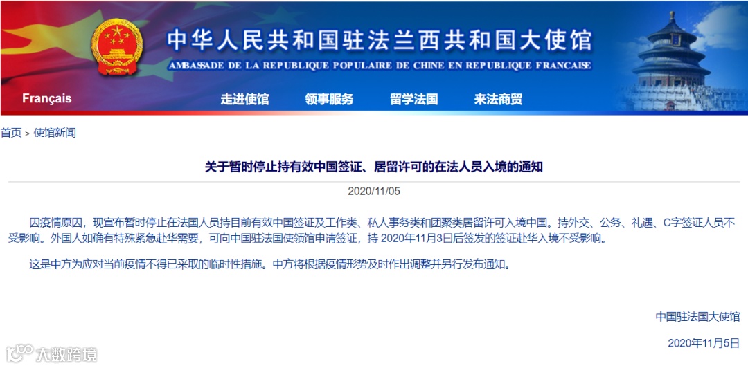 因疫情原因,现宣布暂时停止在法国人员持目前有效中国签证及工作类、私人事务类和团聚类居留许可入境中国。持外交、公务、礼遇、C字签证人员不受影响。外国人如确有特殊紧急赴华需要,可向中国驻法国使领馆申请签证,持 2020年11月3曰后签发的签证赴华入境不受影响。
