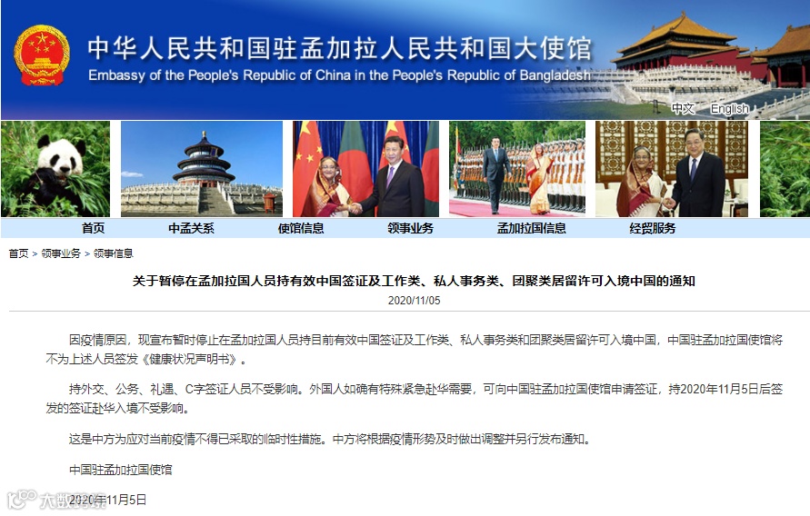 因疫情原因,现宣布暂时停止在孟加拉国人员持目前有效中国签证及工作类、私人事务类和团聚类居留许可入境中国,中国驻孟加拉国使馆将不为上述人员签发《健康状况声明书》。