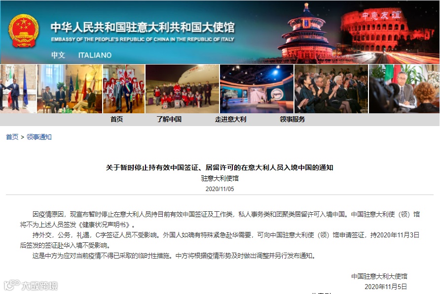 持外交,公务,礼遇,C字签证人员不受影响。外国人如确有特殊紧急赴华需要,可向中国驻意大利使(领)馆申请签证,持2020年11月3日后签发的签证赴华入境不受影响。