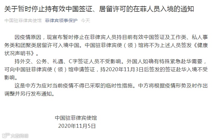 11月5日,中国驻菲律宾使馆发布关于暂时停止持有效中国签证、居留许可的在菲人员入境的通知,全文如下: