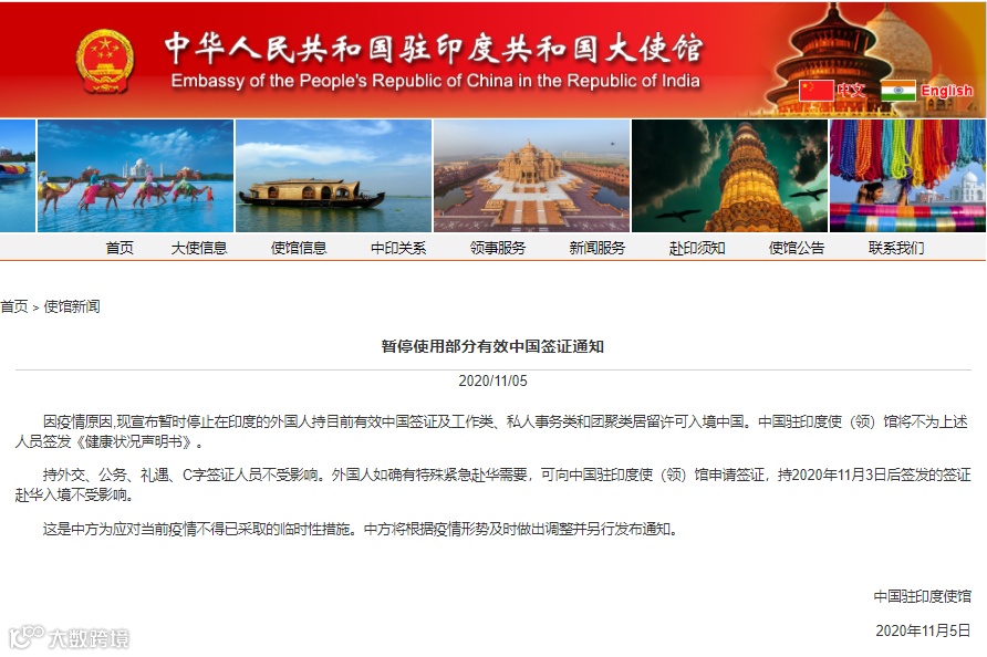 持外交、公务、礼遇、C字签证人员不受影响。外国人如确有特殊紧急赴华需要,可向中国驻印度使(领)馆申请签证,持2020年11月3日后签发的签证赴华入境不受影响。