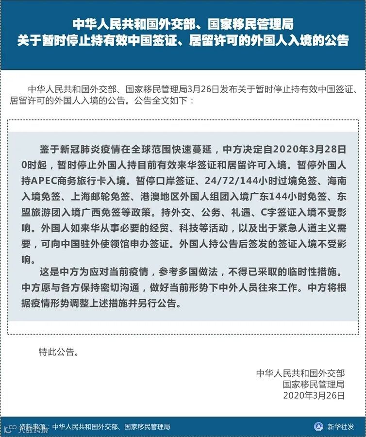 根据当前新冠肺炎疫情形势及防控需要,现对2020年3月26日外交部、国家移民管理局联合发布的《关于暂时停止持有效中国签证、居留许可外国人入境的公告》部分措施调整如下: