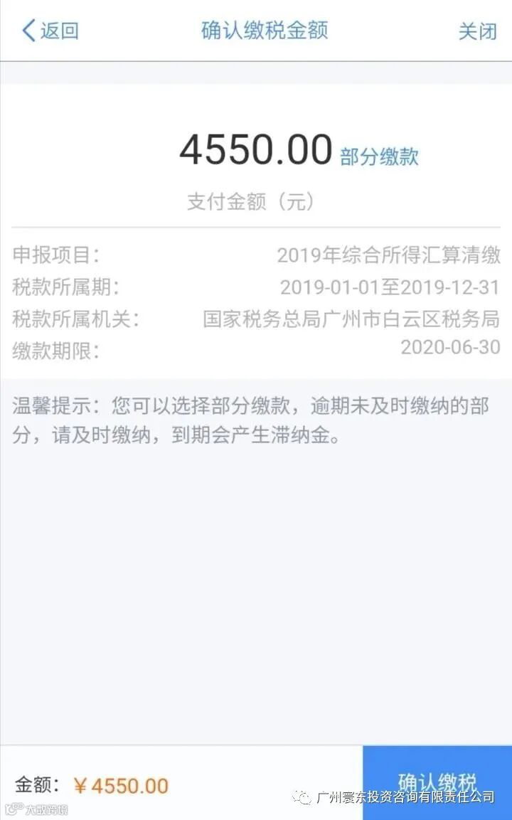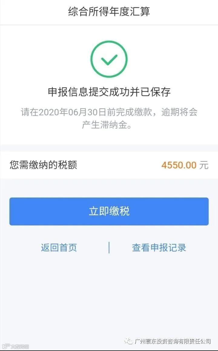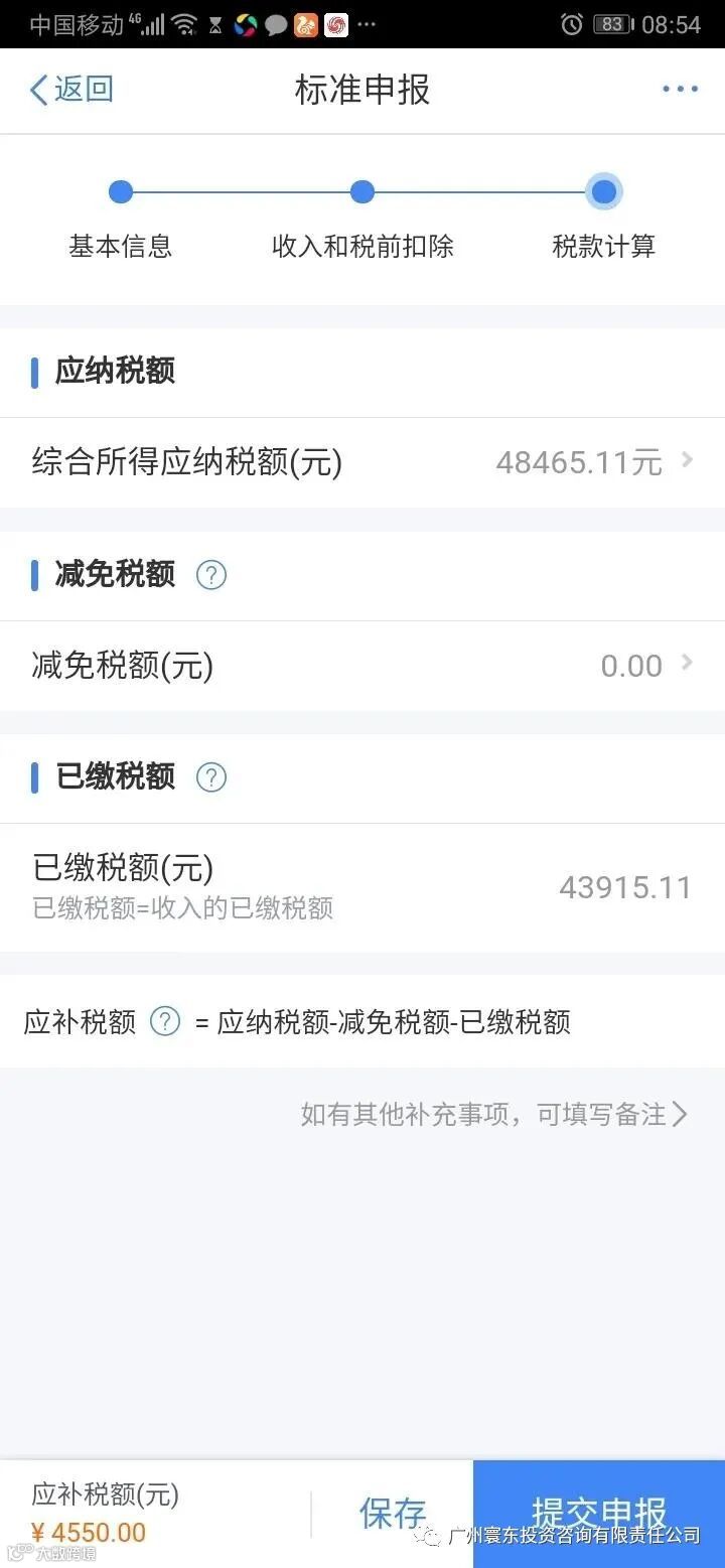 (2)进入【税款计算】页面,查看应退税款或应补税款,提交申报