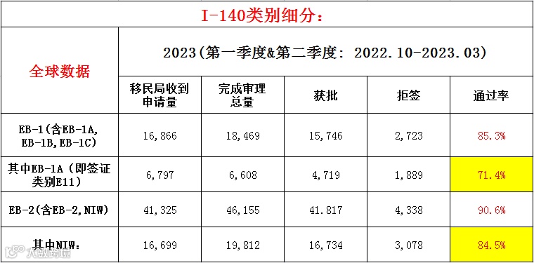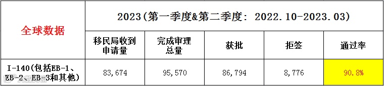 2023财年第一季度和第二季度,EB-2接收申请数为41,325份,完成审理46,155份,其中获批 41,817份,拒签4,338份,通过率为90.6%(其中NIW 接收申请16,699份,完成审理19812份,获批16734份,拒签3078份,通过率为84.5%)。