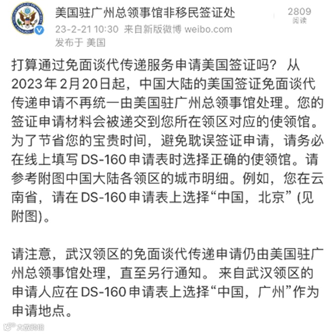 在2023年2月20日起,免面谈代传递申请不再统一由美国驻广州总领事馆处理。申请人的材料会被递交到所在领区对应的使领馆(同时领馆提醒:为了节省申请人时间,避免耽误签证申请,请务必在填写DS160申请表时选择正确的使领馆)。