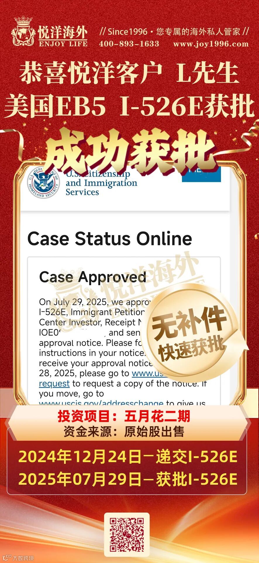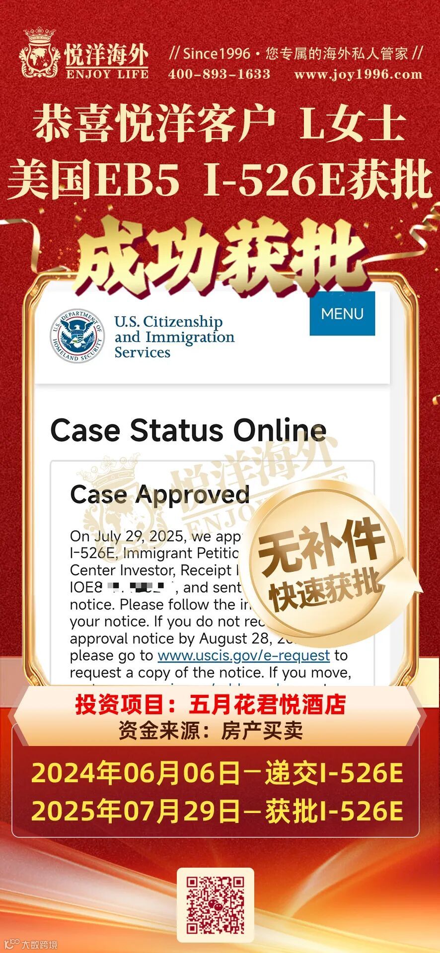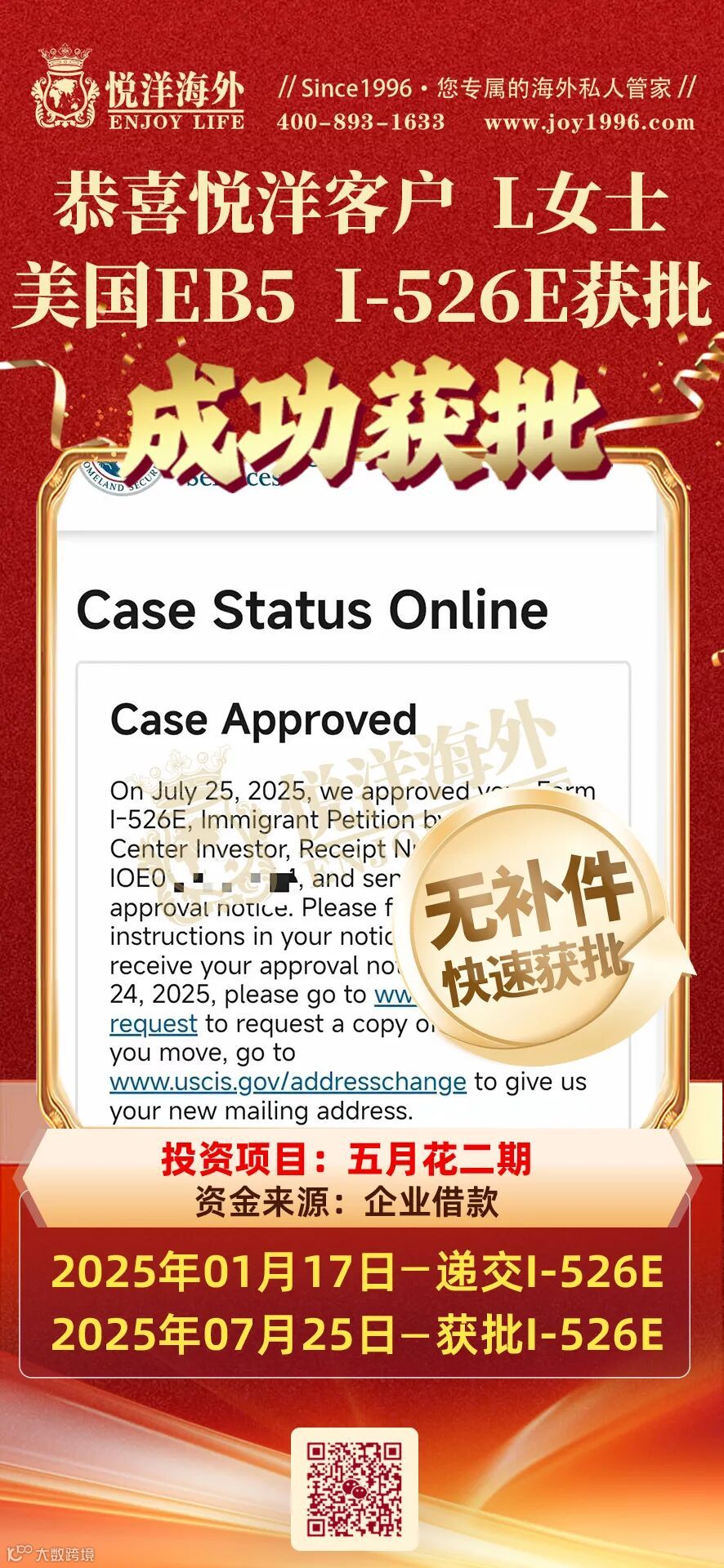 恭喜L女士EB5 I526E获批