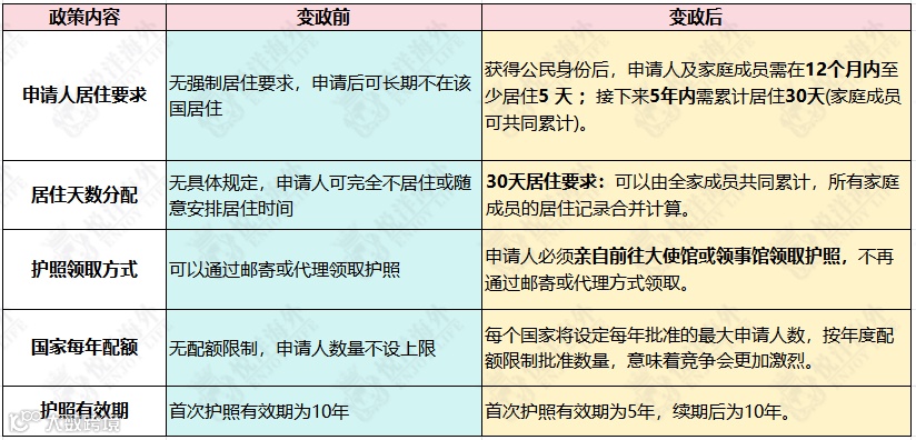 根据联合协议,新规要求所有通过投资入籍(CBI)计划获得公民身份的申请人,需在获得国籍后的前5年内累计居住30天。