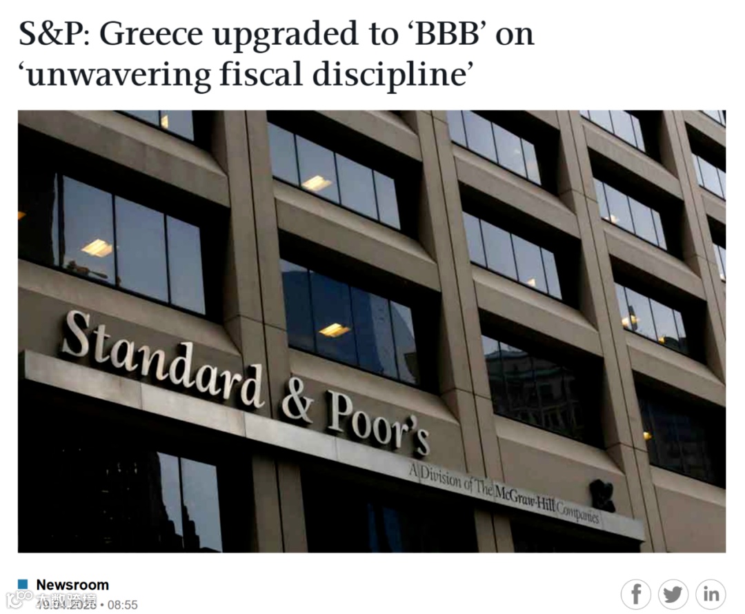 4月18日,标准普尔将希腊主权信用评级从BBB-上调至BBB,评级展望为稳定。