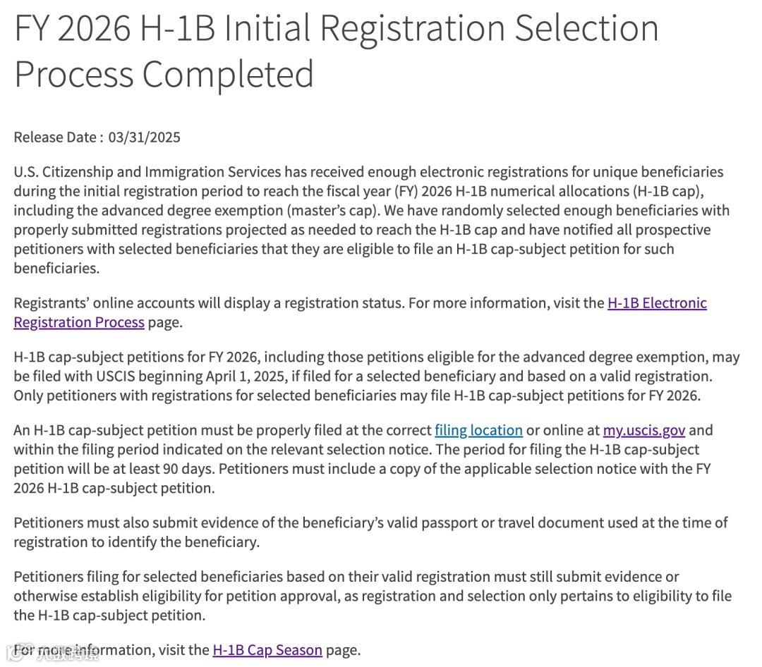 美国移民局(USCIS)于美西时间2025年3月31日正式宣布,2026财年H-1B签证初始注册流程顺利结束,并已完成随机抽签程序。根据最新系统更新显示,所有中签状态已通过官方平台同步至雇主端。