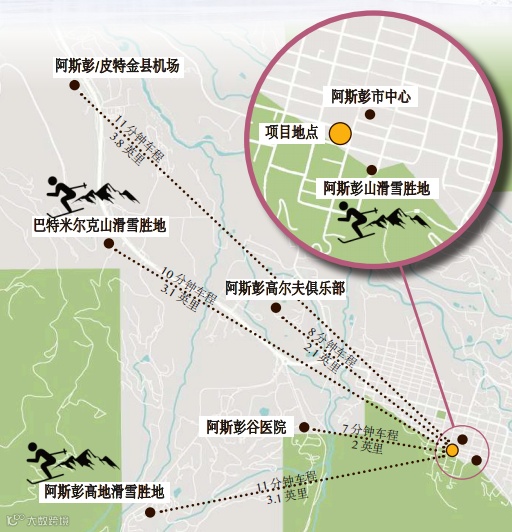 项目位于阿斯彭市中心东杜兰特大道333号,步行即可抵达主街(Main Street)和阿斯彭山滑雪缆车,驱车10分钟内可达: