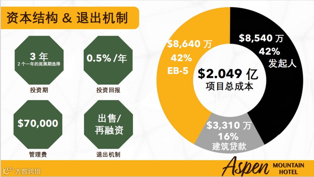阿斯彭山悦顶奢酒店项目总成本是$2.049亿,其中,EB-5募集金额$8,640万,占42%,投资期限是3年,可延期2年,采用RIMS-II模型计算,预计创造1,998个就业 ,超移民局要求1.85倍 !提供完工担保+拒签还款担保,双重风控为投资护航。