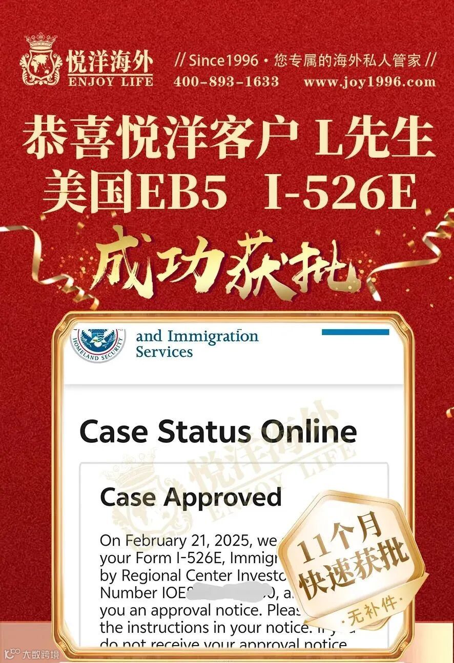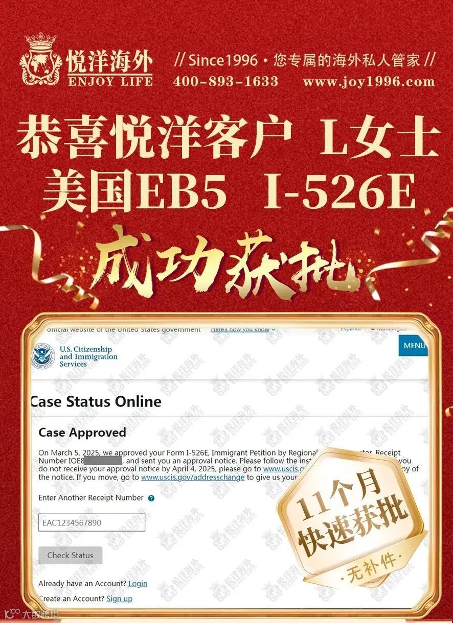 恭喜L女士,80后,为了小孩得到更好的教育,I-526E在2024年3月26日递交,2025年3月5日无补件获批,客户项目: 五月花一期君悦酒店。