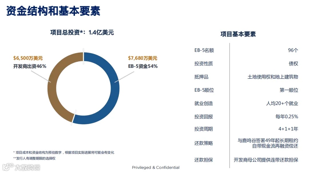 项目总投资为1.4亿美元,招募96个投资人,EB-5资金7,680万美元,占54%,开发商母公司提供连带的还款担保,资金安全会有切实有力的保障机制。EB-5为第一顺位债权,享有土地和地上建筑物作为抵押品,并且将完成抵押品登记流程。