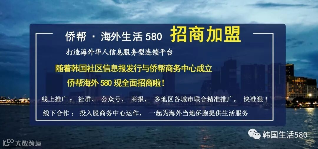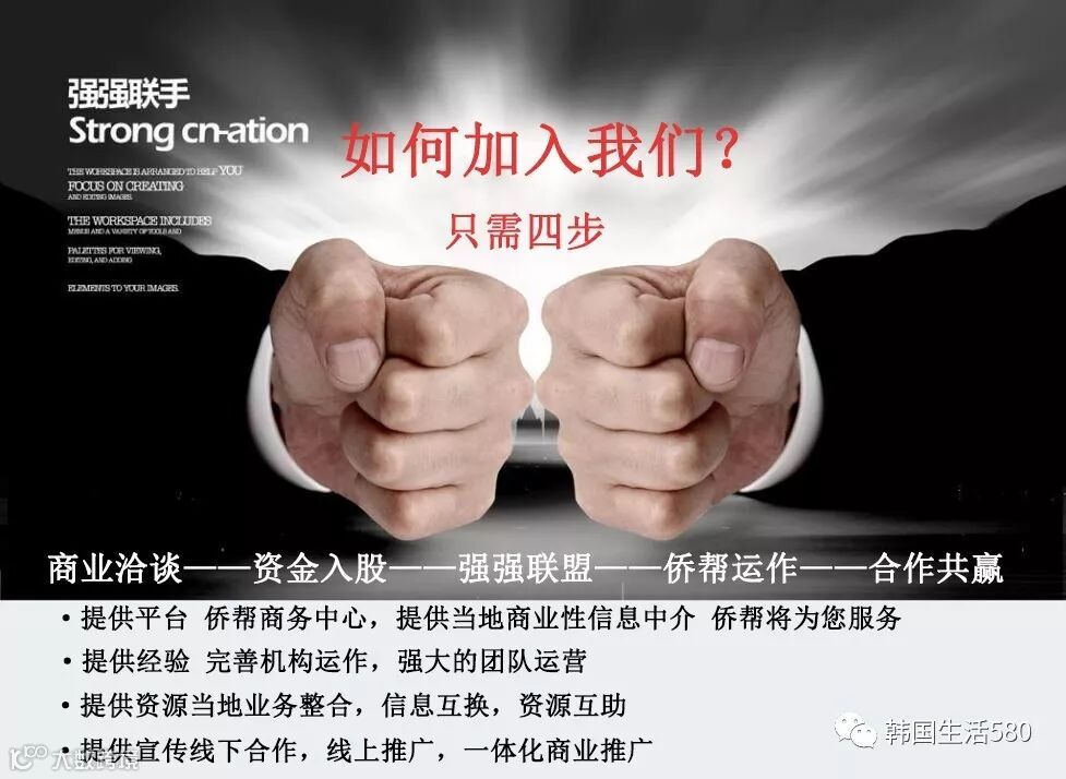 今日我们成立韩国当地各大城市的侨帮商务中心侨帮在此诚邀在韩国各大城市从事商业服务性内容的合作伙伴前来加盟