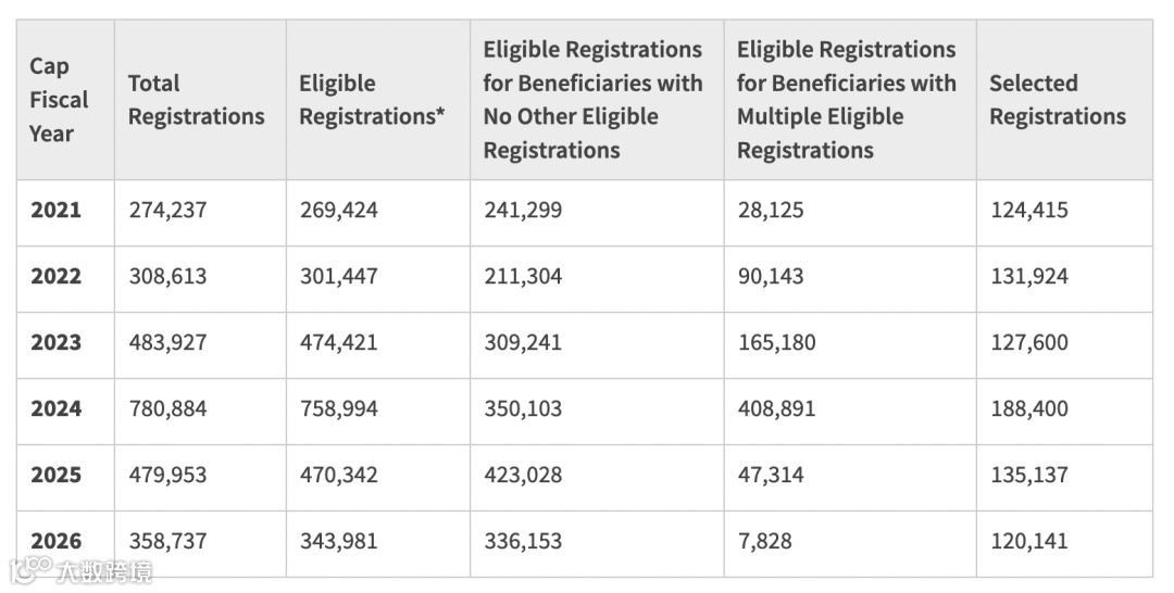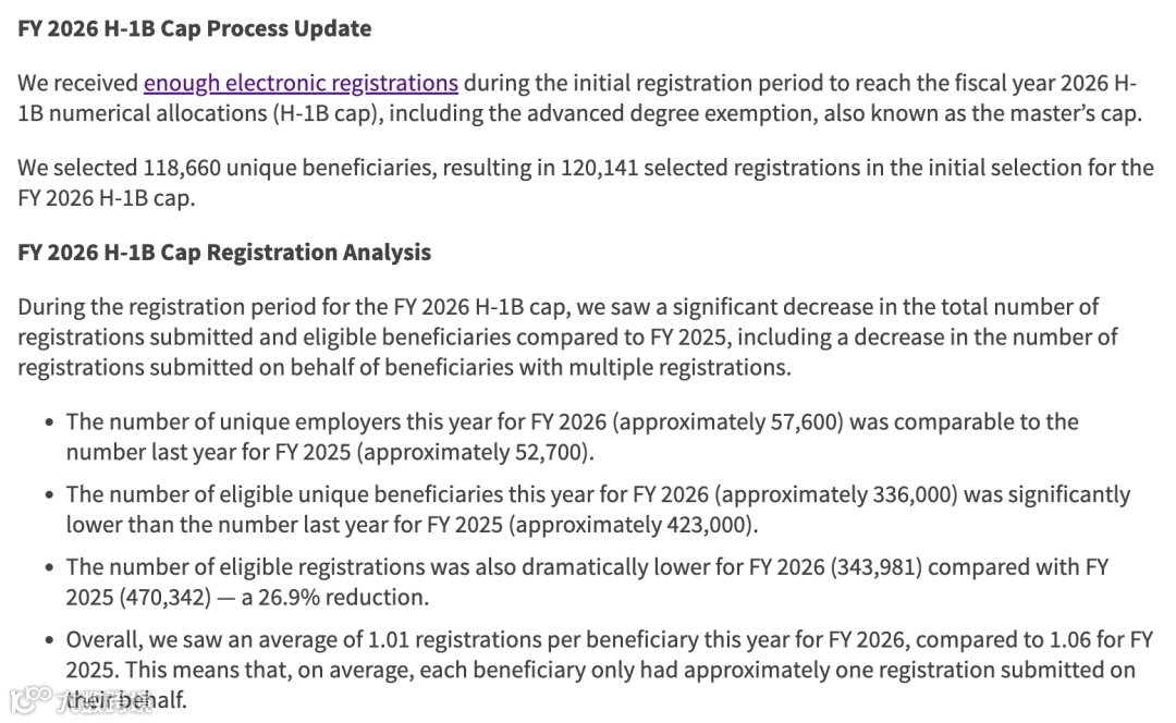 总注册量暴跌26.9%:从2025财年的47万份,直接降至2026财年的34万份,近乎断崖式下跌。这清晰地表明,雇主们为外籍员工申请H-1B的热情大幅冷却。