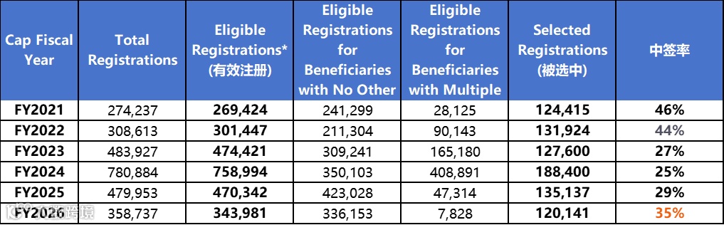 近日,美国移民局重磅公布了2026财年H-1B抽签结果,这一消息瞬间在留美人士的圈子里炸开了锅。总注册量358,737份,有效注册343,981份,中签人数120,141人,整体中签率提升至35%。乍一看,中签率上升似乎是个好消息,可当我们深入剖析核心数据,却发现事情远没那么简单。