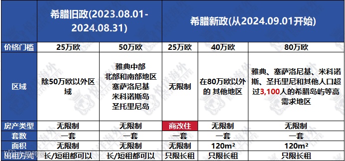 希腊在2023年9月,从25万欧,涨价为25万欧和50万欧区域。